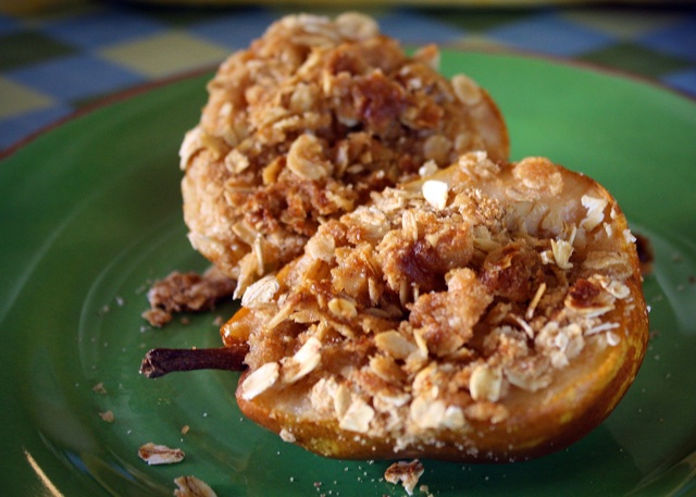 I was thinking of the baked apples I enjoyed as a kid and since I had some pears at home, I thought I would try a recipe for Baked Pears with Oatmeal Crumble Topping — a great dessert that’s not over-the-top. I added a crumble topping to the pears and they turned out really well — no special pans or extra-special ingredients required. A quick prep and a short time in the oven, and I had a delicious dessert good enough for company, and perfect to me!