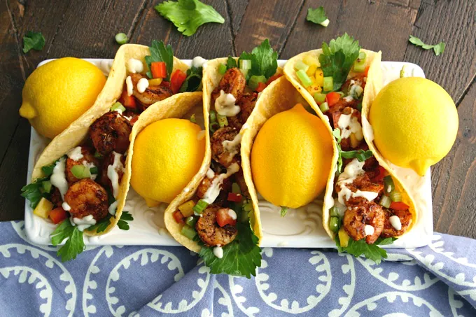 Blackened Shrimp Tacos & Creamy Garlic-Lemon Sauce is big on flavor and can be on the table in under 20 minutes. I used ingredients you’ll find in Cajon and Creole cooking to keep them perfect for the day.