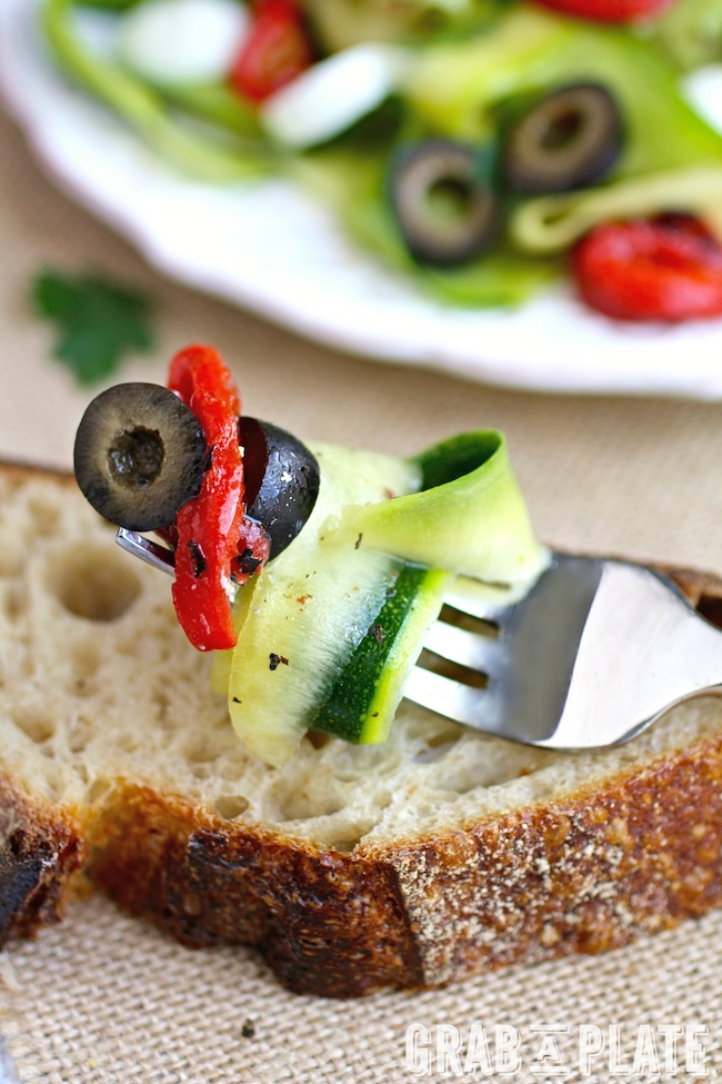 Take a cue from the season for your next meal: What better way to use up the summer’s abundance of zucchini than with a light, healthy, and flavorful dish like Chilled Zucchini Ribbon “Pasta” with Black Olives, Roasted Red Peppers and Mozzarella?