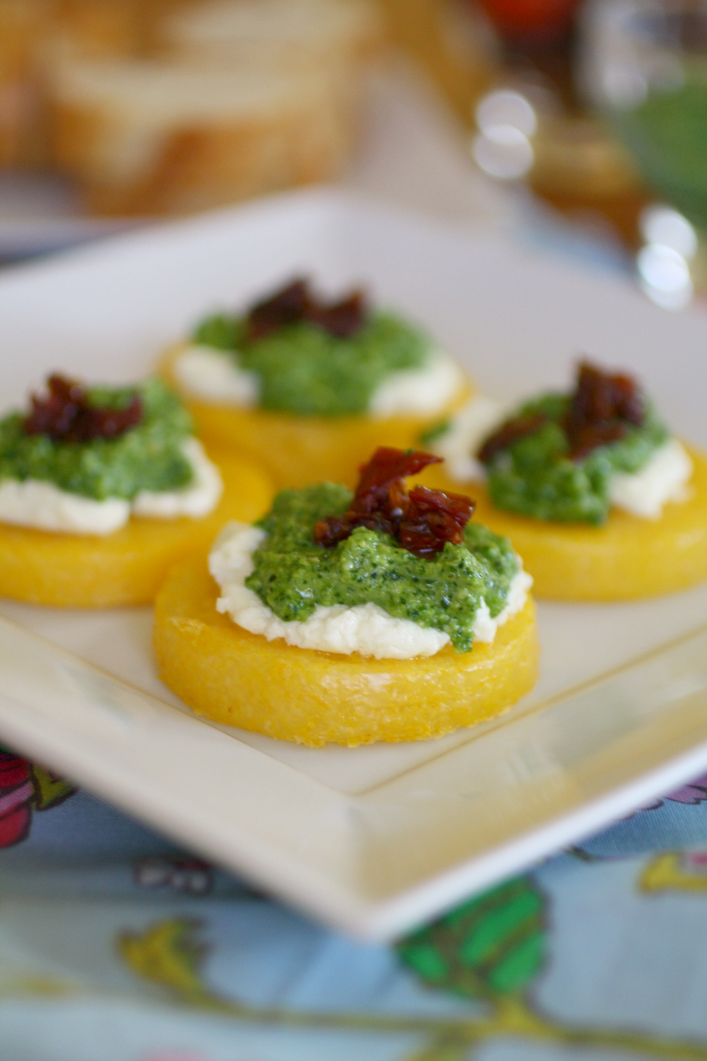 - Top each slice with 1 teaspoon (or slightly less) of the pesto.