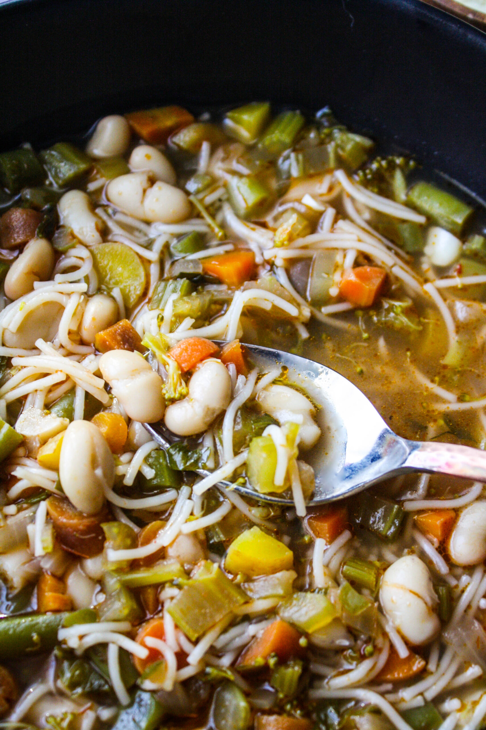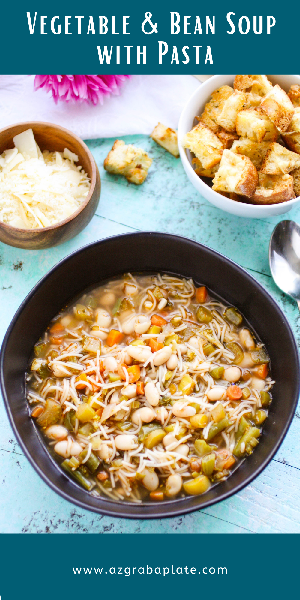 If you’re looking for an easy and hearty soup to serve, Vegetable and Bean Soup with Pasta is it! I used small vermicelli noodles, but you can use whatever you have on hand, like orzo, or even regular spaghetti noodles broken into small pieces.